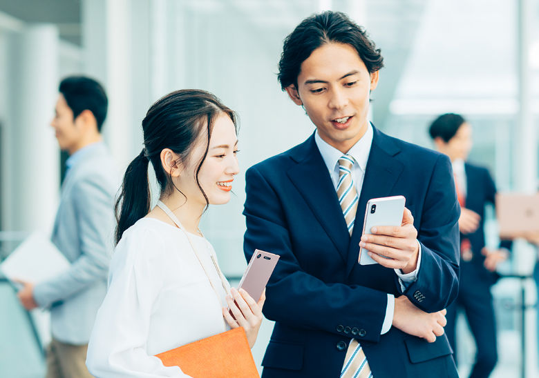 携帯  ビジネススーツを着た男性と女性が携帯電話を持っている